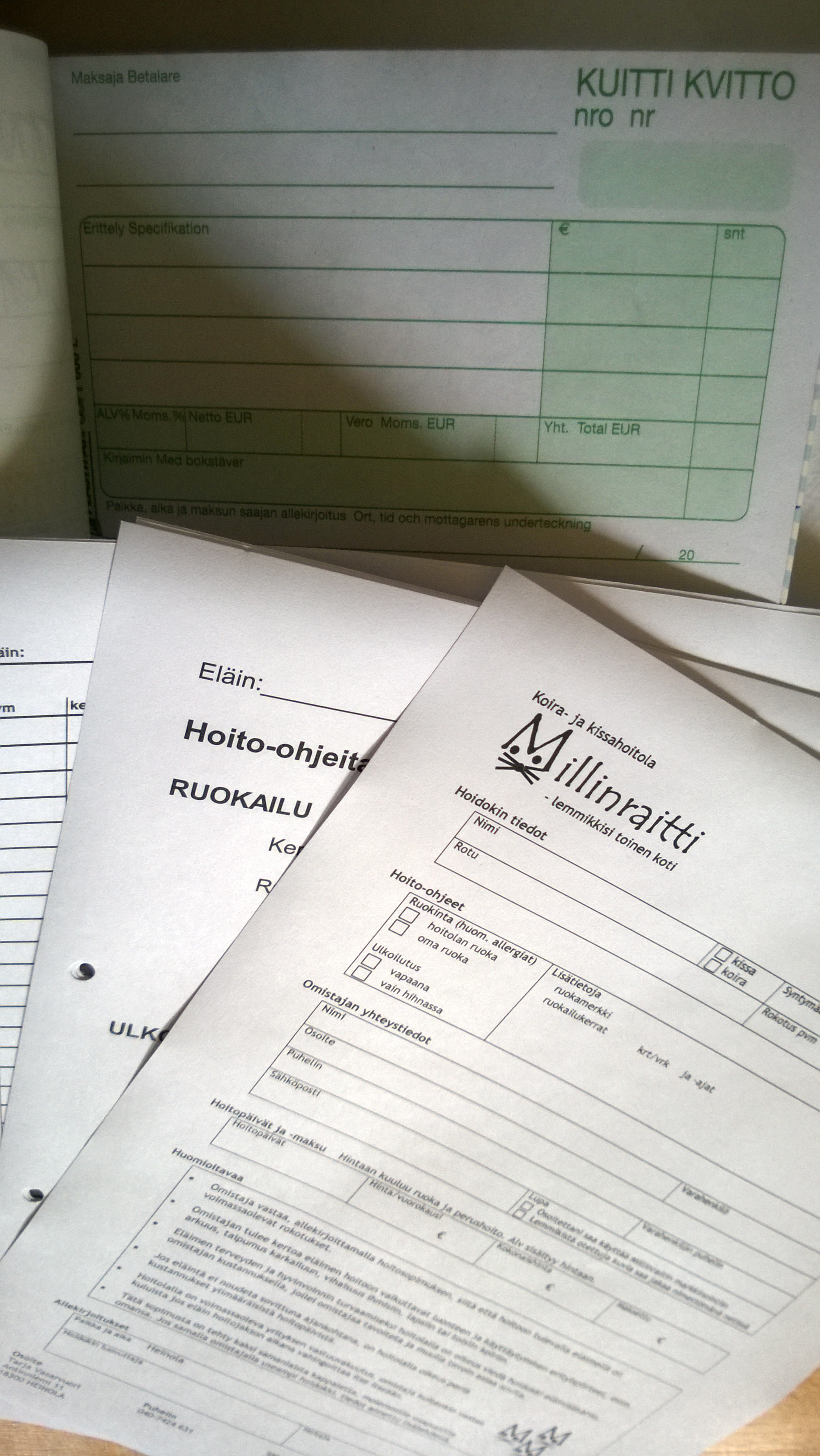 Lemmikistä tehdään jokaisella hoitokerralla hoitosopimus. Ensimmäisellä kerralla se kestää hieman kauemmin kun samalla kysellään myös koiran/kissan ”käyttöohjeet” . Tähän kannattaa varata n. 10-15 minuuttia aikaa. Hoidokin tullessa uudelleen, tehdään sopimukseen muutokset jo valmiiksi ja ei tarvitse kuin nimi kirjoittaa alle.